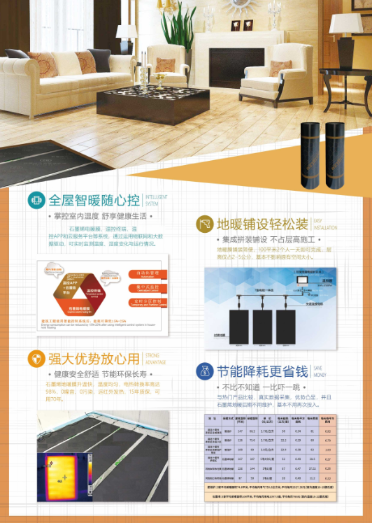 石墨烯電地暖通過將電能直接轉(zhuǎn)換成熱能,以石墨烯紅外輻射方式傳熱,不加熱空氣,不消耗空氣中的水分、氧氣,直接對室內(nèi)物體達到供熱效果,因此人們有感到采暖很舒適的效果,產(chǎn)品可安裝在地面以下或墻壁上,還可以采用手機APP遠程控制,操作十分方便。